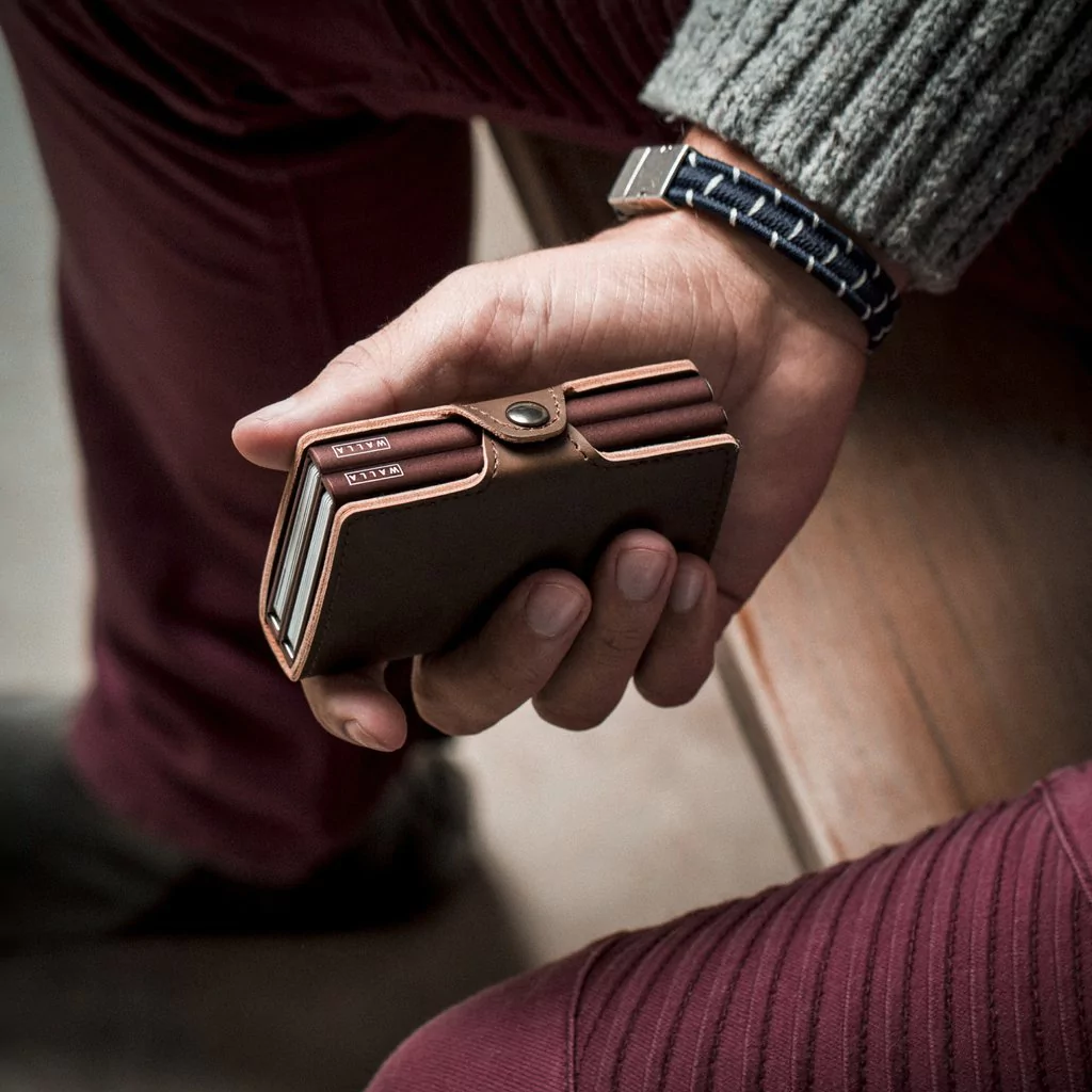 Billetera de cuero tipo Vintage y Card Slider fabricado en Aluminio sólido ultrafino.